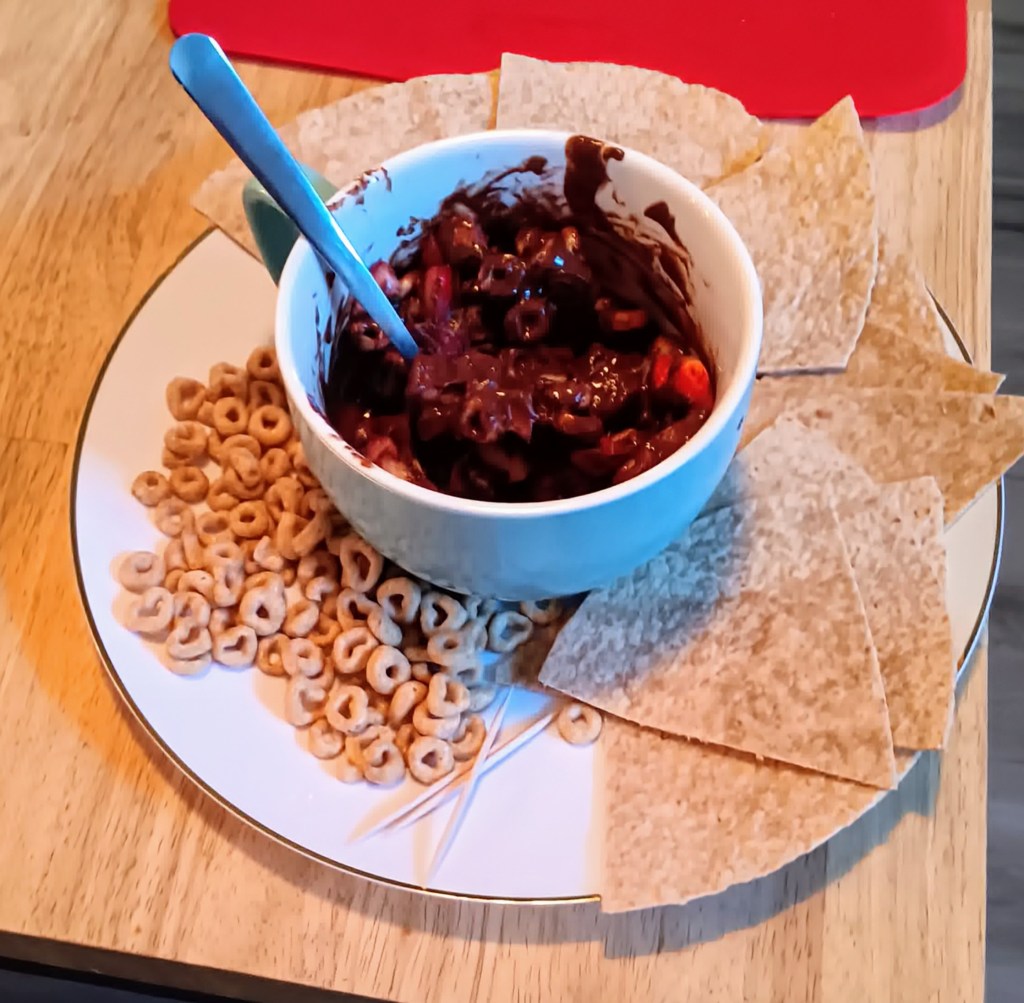 Put your chocolate peanut butter into a bowl and heat in microwave for 1 minute in 30 second intervals. Cut your strawberries and add them and the cheerios into the chocolate peanut butter. Then, cut your tortillas into triangle shapes. Use them to eat the dip.