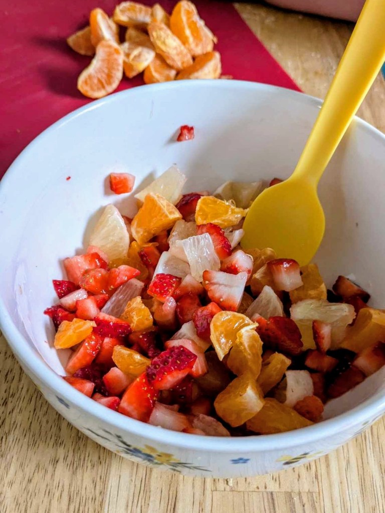 Peel and cut your orange and lemon into small cubes. Dice your strawberries and add to the citrus mix in a bowl. Then add simple syrup over everything and mix.