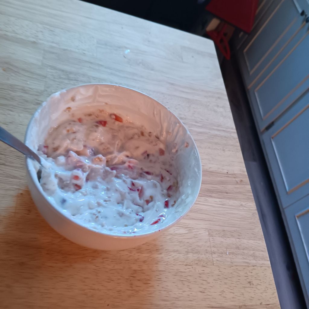 Start by cutting strawberries into small pieces, then add that and your yogurt to a bowl then mix. Add your honey and mix one more time, and you’re done.